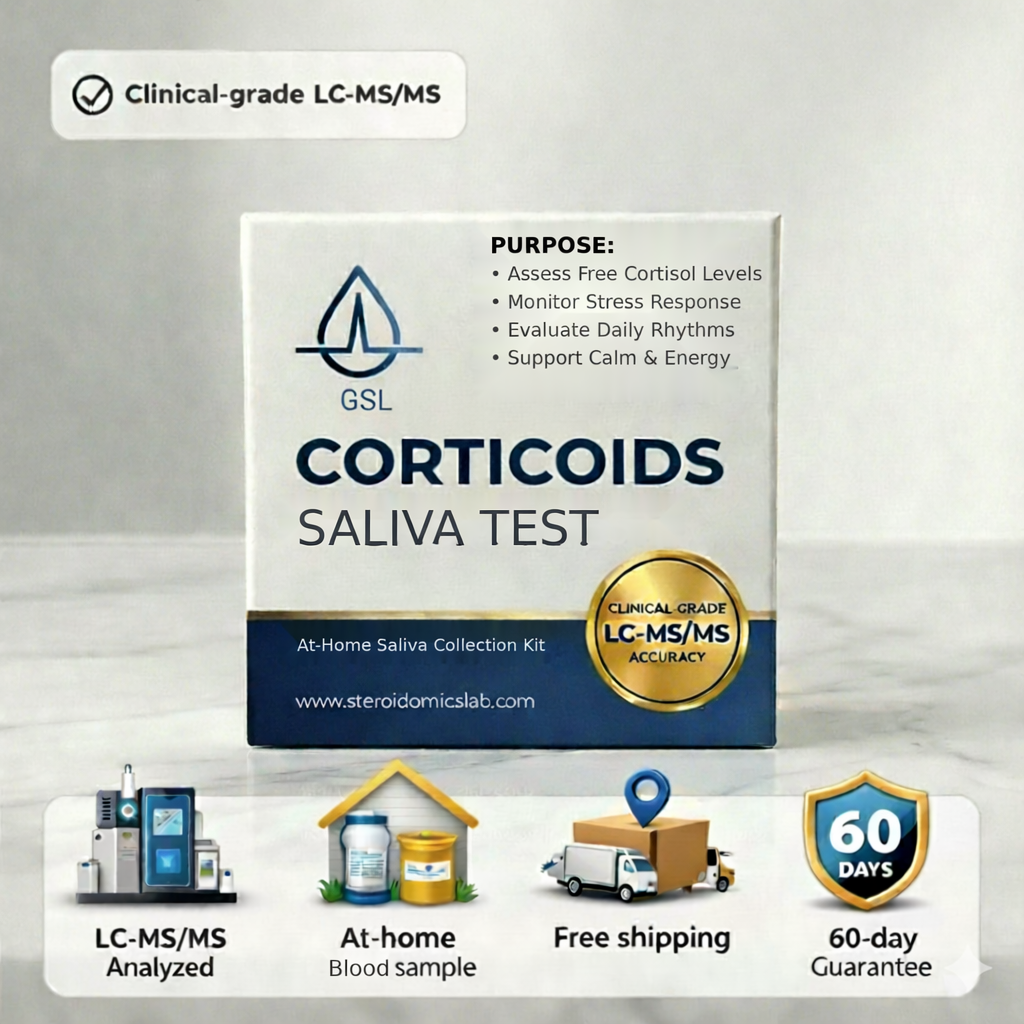 The GSL Cortisol Saliva Home Test Kit measures cortisol from a simple saliva sample collected at home. Salivary cortisol reflects the free, biologically active form of cortisol that circulates in your body. Your sample is analyzed in our LC-MS/MS lab for accurate assessment of your stress hormone level. This test provides information about cortisol and is not a diagnosis or a substitute for medical care.