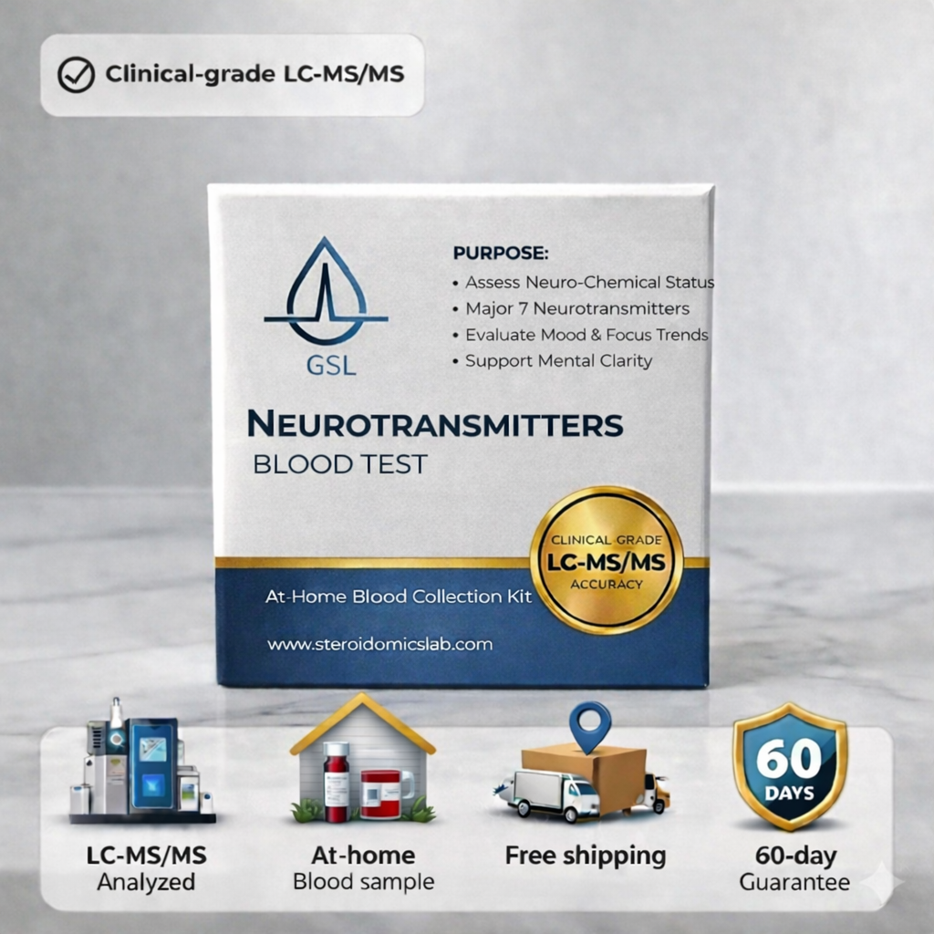 The GSL Neurotransmitter Blood Home Test Kit measures key neurotransmitters and related metabolites from a small blood sample. These messengers are involved in mood, focus, stress response, and sleep–wake balance. Samples are analyzed using LC-MS/MS technology. This test provides information about neurotransmitter-related biomarkers and is not a diagnosis or a substitute for medical care.